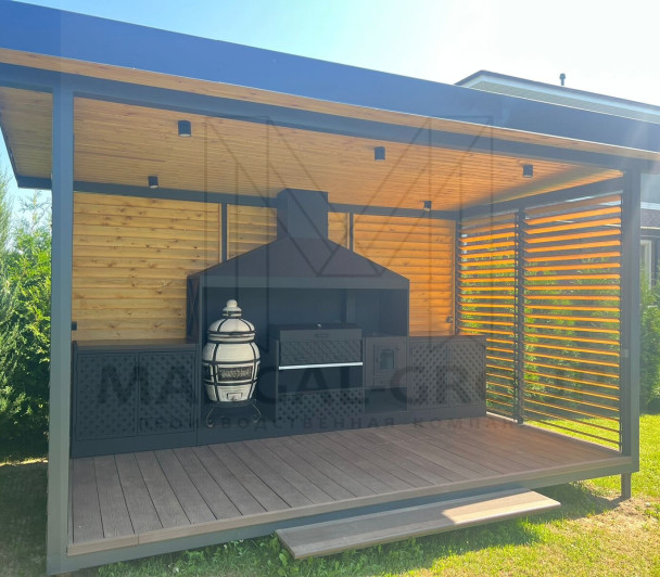 Изготовленный из первоклассных, жаропрочных материалов мангальный комплекс с мощной вытяжкой, трубой под дымоход разрешено устанавливать в помещении. Часто он дополнительно оснащается раковиной, вместительными открытыми и закрытыми шкафами для хранения кухонной утвари, рабочими столешницами для нарезки и другой обработки продуктов. Опытный производитель сделает проект индивидуально под заказ с соблюдением требованием пожаробезопасности, с учетом особенностей помещения, желаемой комплектации и других факторов.