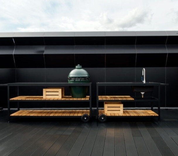 Стол для гриля по проекту «Хай-тек» соединяет функциональность с оригинальным дизайном, он хорошо вписывается в мангальную зону приусадебного участка. Его рабочая зона имеет расширенную поверхность, на ней устанавливается керамический гриль. Столешница изготовлена из искусственного камня, полки – из древесины. Кроме гриля на рабочей поверхности также размещается раковина.